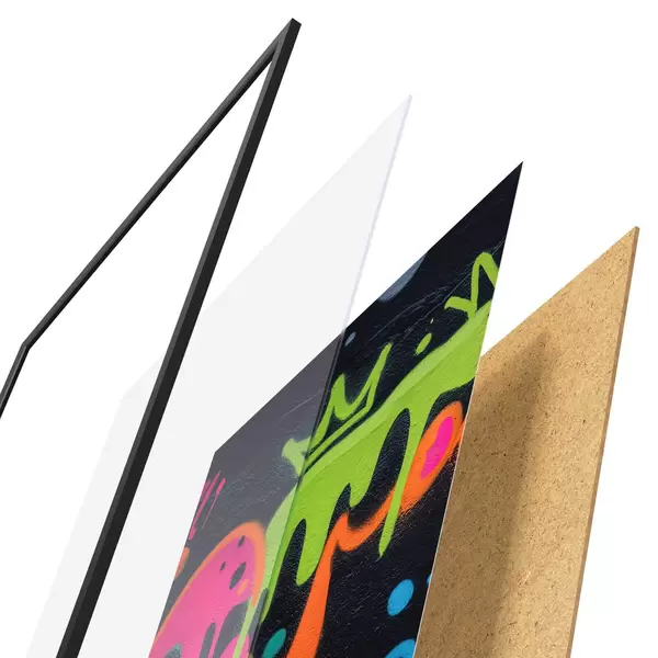 Постер складається з рами, оргскла, надрукованого зображення та підкладки з ДСП. Завдяки кріпленням на звороті плакат можна одразу ж повісити на стіну.
