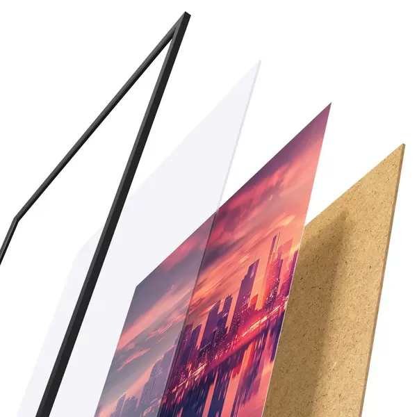 Постер складається з рами, оргскла, надрукованого зображення та підкладки з ДСП. Завдяки кріпленням на звороті плакат можна одразу ж повісити на стіну.