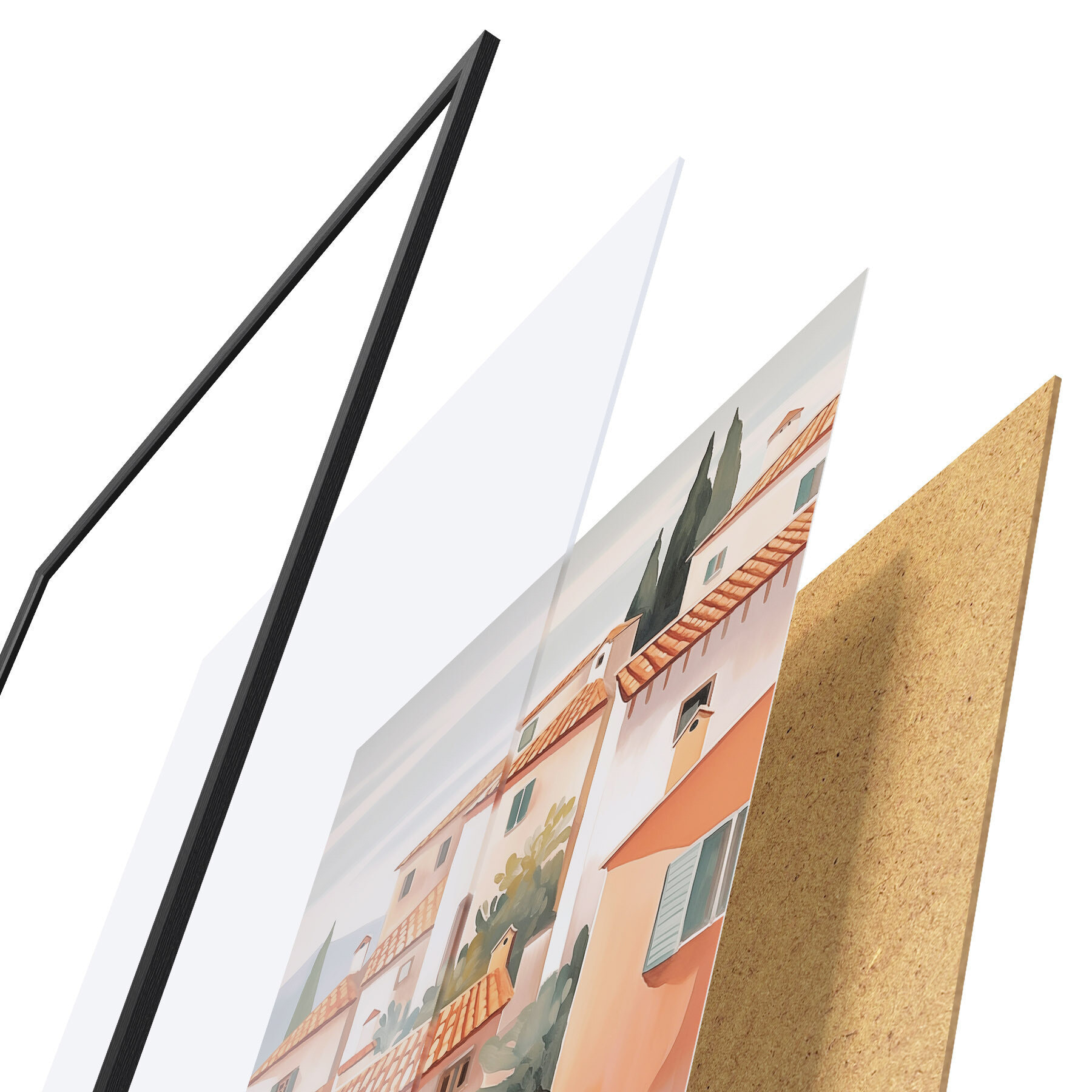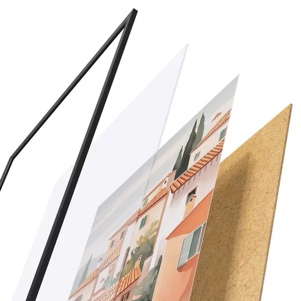 Постер складається з рами, оргскла, надрукованого зображення та підкладки з ДСП. Завдяки кріпленням на звороті плакат можна одразу ж повісити на стіну.