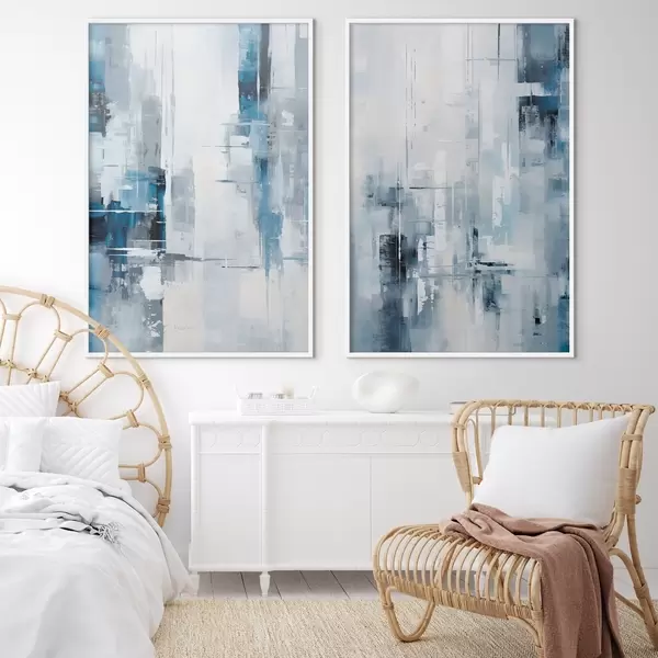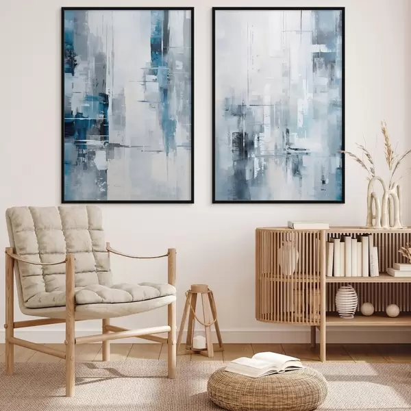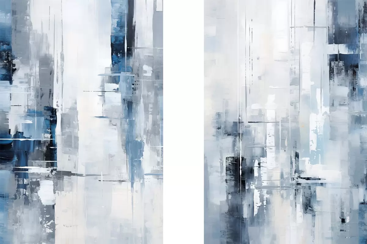 Постер на стіну Абстрактна імітація живопису з використанням синього, сірого та білого кольорів, вертикальних ліній та геометричних фігур Nr d00819