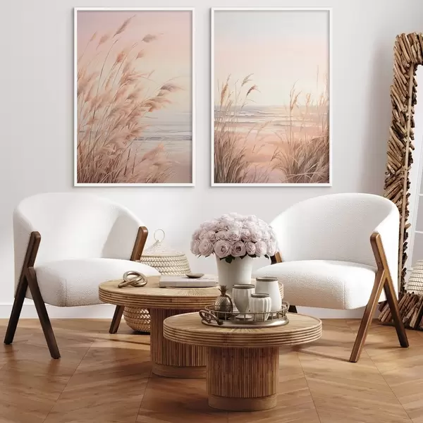 Постер на стіну Трава пампас з пастельною помаранчевою кольоровою гамою, світло-рожеве небо, спокійний пейзаж Nr d00823