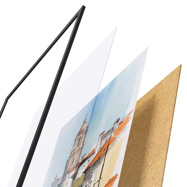Постер складається з рами, оргскла, надрукованого зображення та підкладки з ДСП. Завдяки кріпленням на звороті плакат можна одразу ж повісити на стіну.