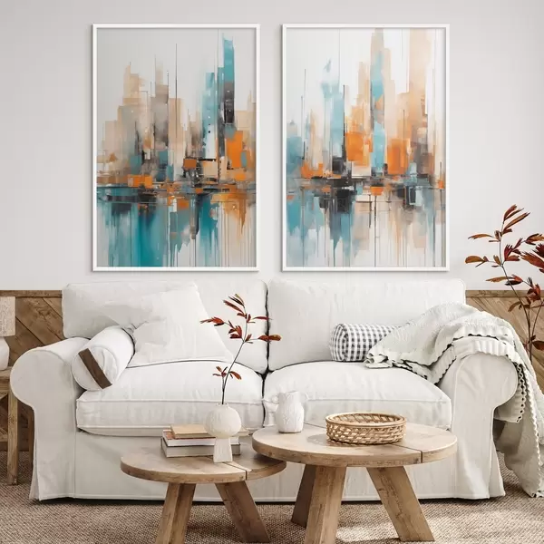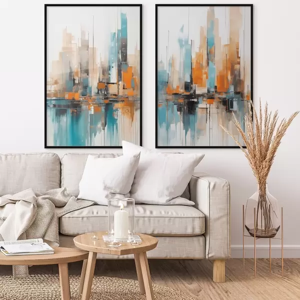 Постер на стіну Абстрактний міський пейзаж з вертикальними мазками в відтінках оранжевого, синього та білого, стиль живопису Nr d00876