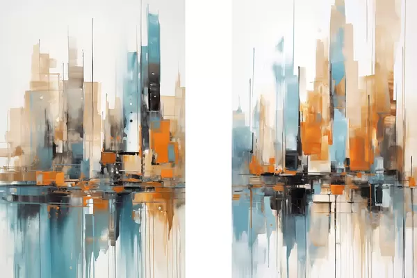 Постер на стіну Абстрактний міський пейзаж з вертикальними мазками в відтінках оранжевого, синього та білого, стиль живопису Nr d00876