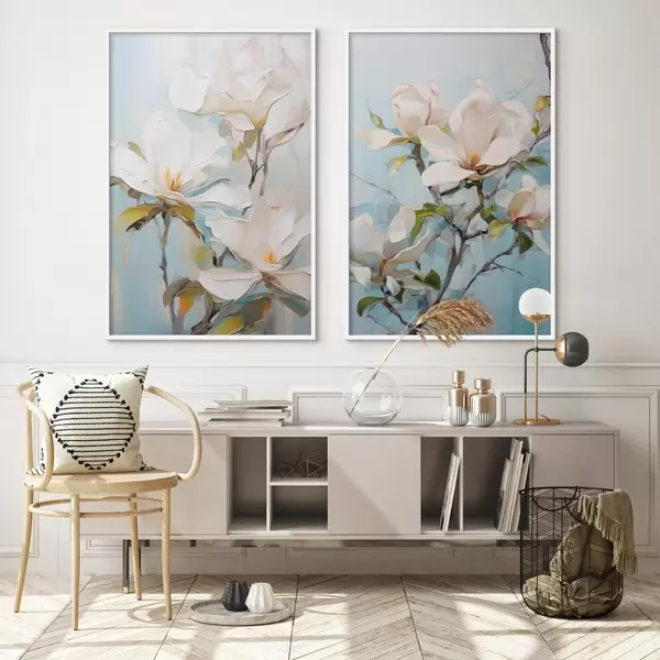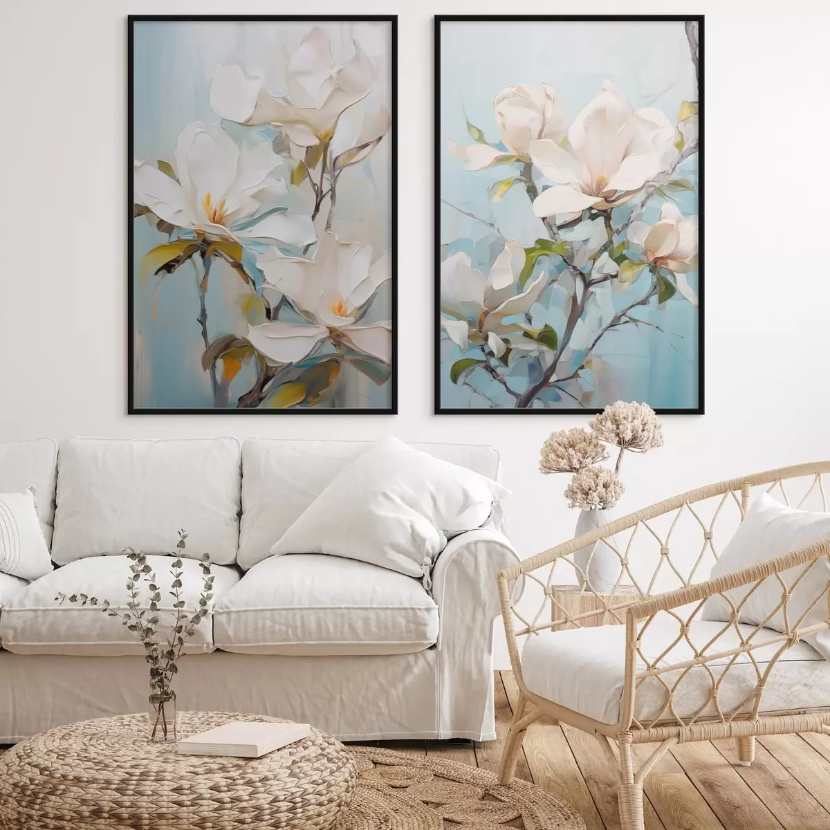 Постер на стіну Білі квіти магнолії, світло-блакитний фон з м'якими мазками пензля, стиль олійного живопису, імпасто-текстура Nr d00881
