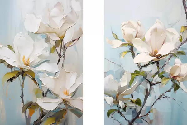 Постер на стіну Білі квіти магнолії, світло-блакитний фон з м'якими мазками пензля, стиль олійного живопису, імпасто-текстура Nr d00881