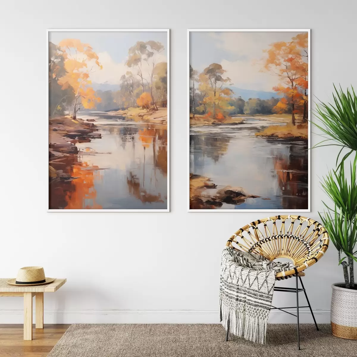 Постер на стіну Осінній пейзаж, річка з деревами на березі, ліс на задньому плані, відблиски на воді Nr d00883