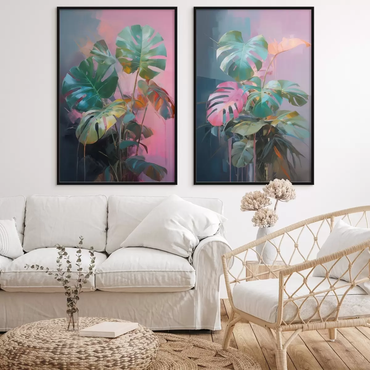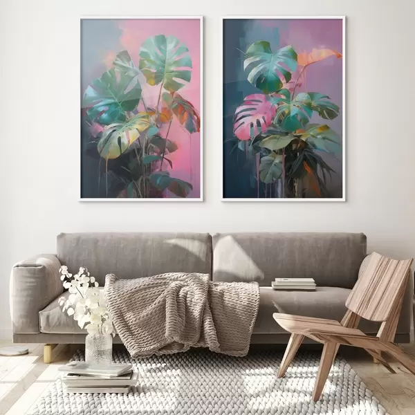 Постер на стіну Абстрактна рослина монстера з яскраво-зеленим листям на тлі ніжних рожевих і фіолетових відтінків Nr d00886