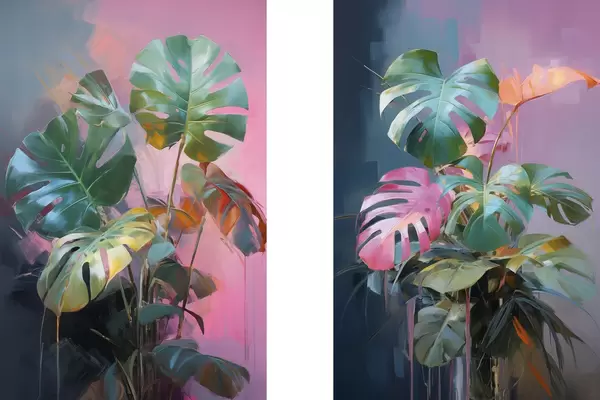 Постер на стіну Абстрактна рослина монстера з яскраво-зеленим листям на тлі ніжних рожевих і фіолетових відтінків Nr d00886