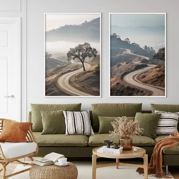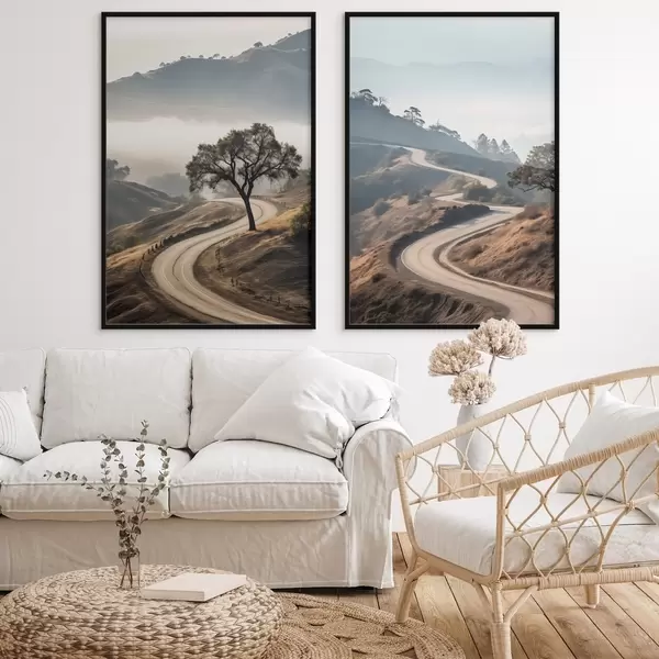 Постер на стіну Звивиста дорога через горбистий ландшафт з сухою травою під чистим небом, а вдалині видніються гори Nr d00887