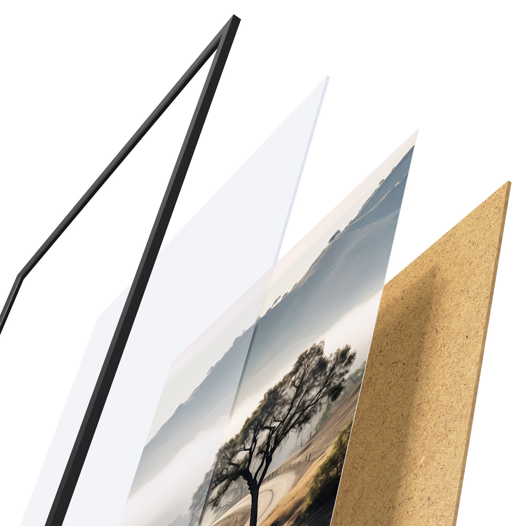Постер складається з рами, оргскла, надрукованого зображення та підкладки з ДСП. Завдяки кріпленням на звороті плакат можна одразу ж повісити на стіну.