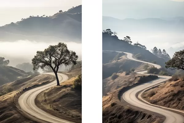 Постер на стіну Звивиста дорога через горбистий ландшафт з сухою травою під чистим небом, а вдалині видніються гори Nr d00887