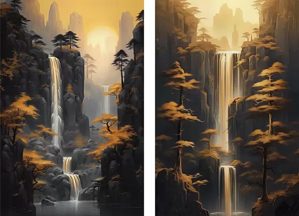 Постер на стіну Пейзаж з водоспадом і горами в золотому світлі Nr d00928