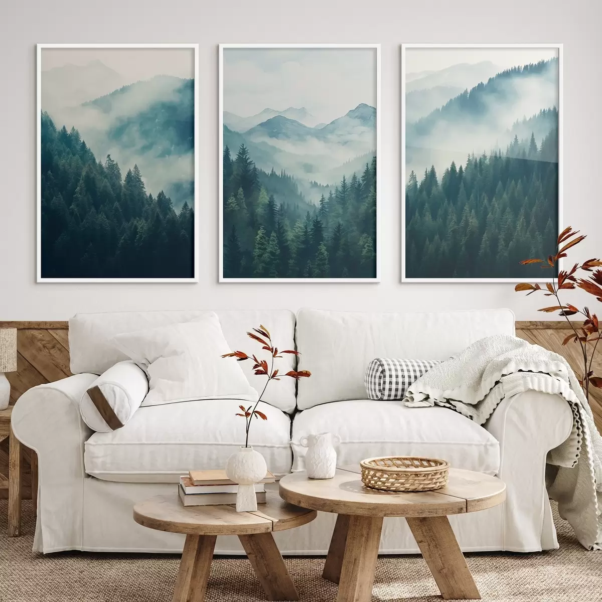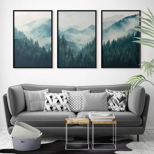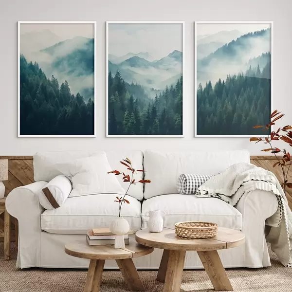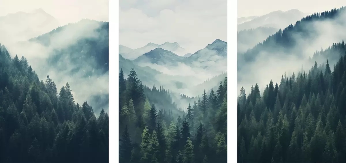 Постер на стіну Туманні соснові гори, вкриті м'якими відтінками зеленого та блакитного кольорів Nr d00964