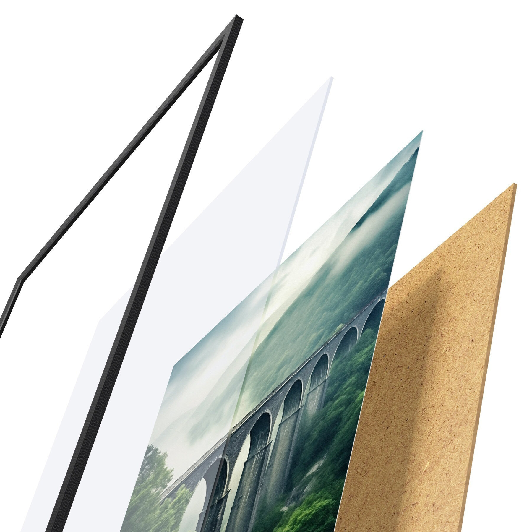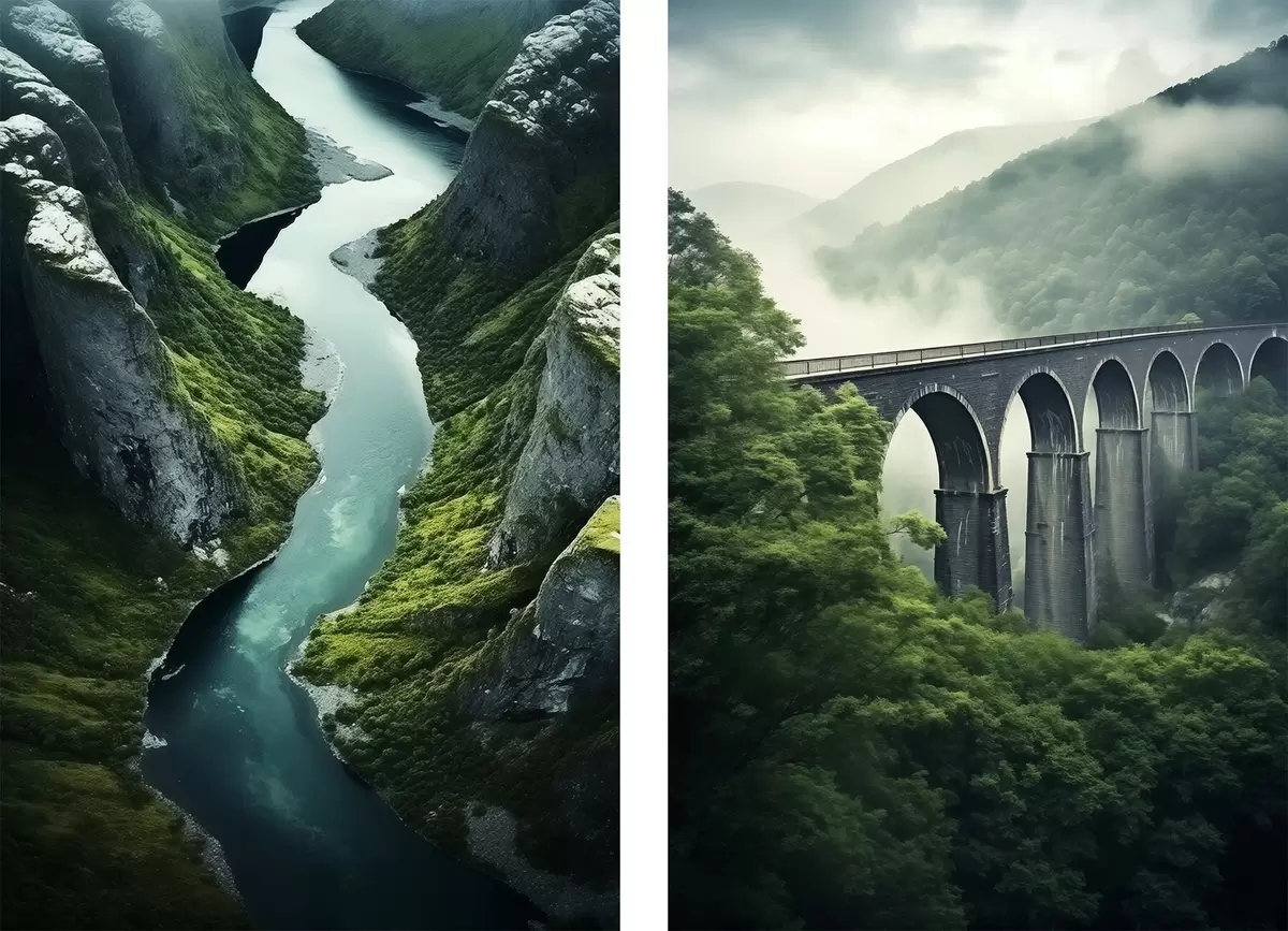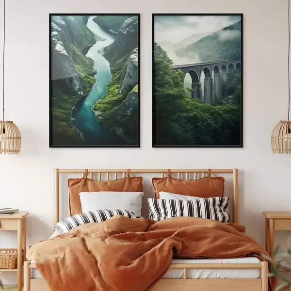 Постер на стіну Повітряний каньйон річки та туманний віадук серед зелених пагорбів Nr d00967