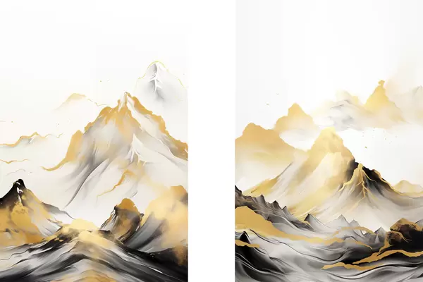 Постер на стіну Текстуровані жовті та чорні гори зі сніговими вершинами, стиль тушового живопису, мінімалістичний гірський хребет Nr d01002