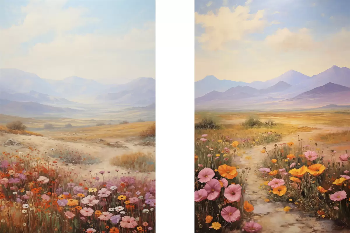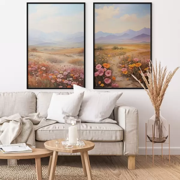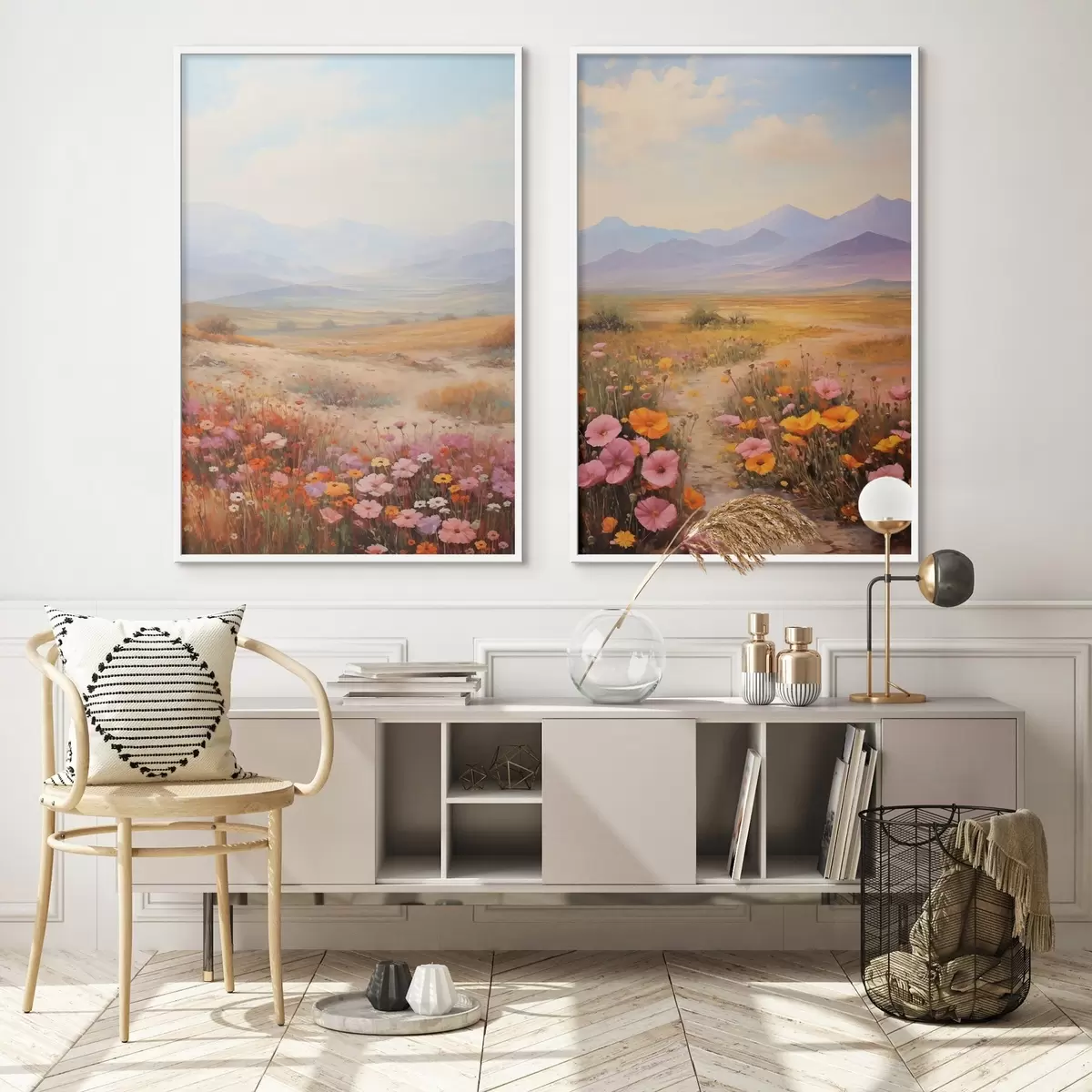 Постер на стіну Пейзаж, поле з барвистими квітами на тлі гір, м'які пастельні кольори Nr d01003
