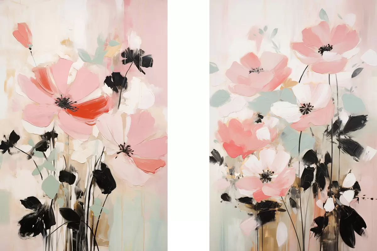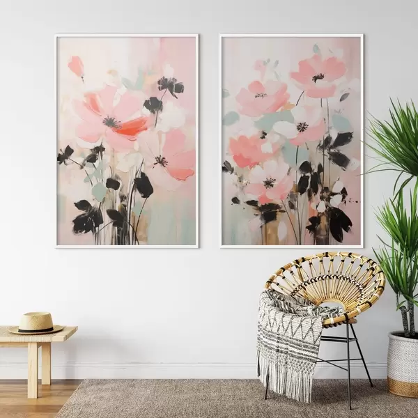 Постер на стіну Рожеві та чорні квіти з листям, м'які пастельні кольори, абстрактна квіткова композиція, мінімалістичне мистецтво Nr d01004