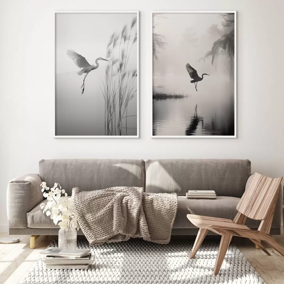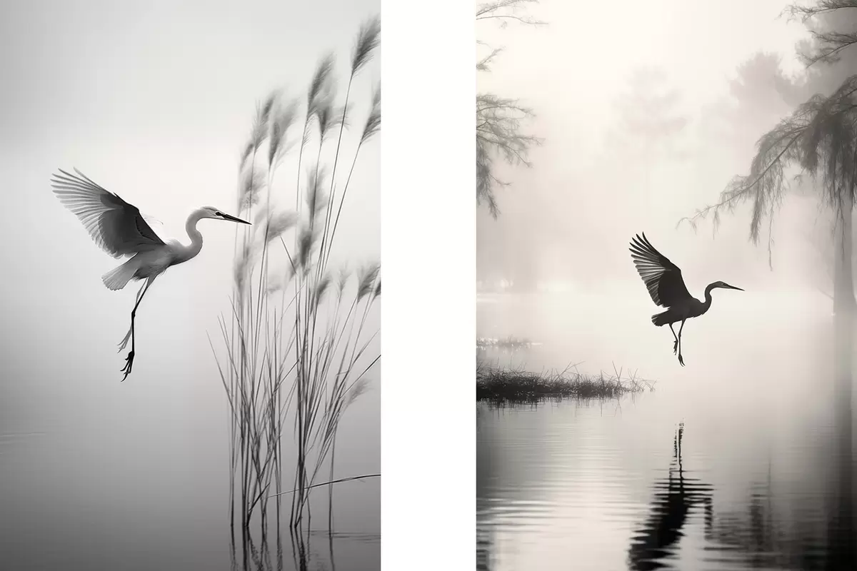 Постер на стіну Біла чапля з розпростертими крилами, що летить біля високих очеретів, чорно-біла мінімалістична композиція Nr d01007