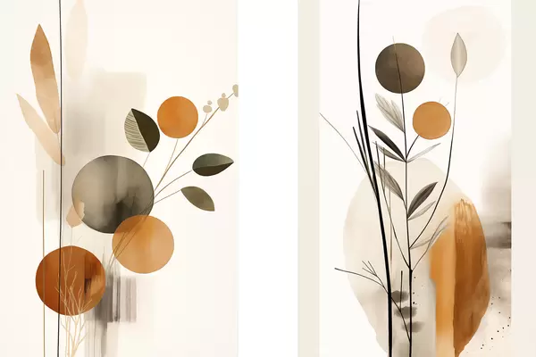 Постер на стіну Абстрактна імітація живопису з помаранчевими та сірими колами, листям і гілками, сучасний стиль, ефект акварелі Nr d01009
