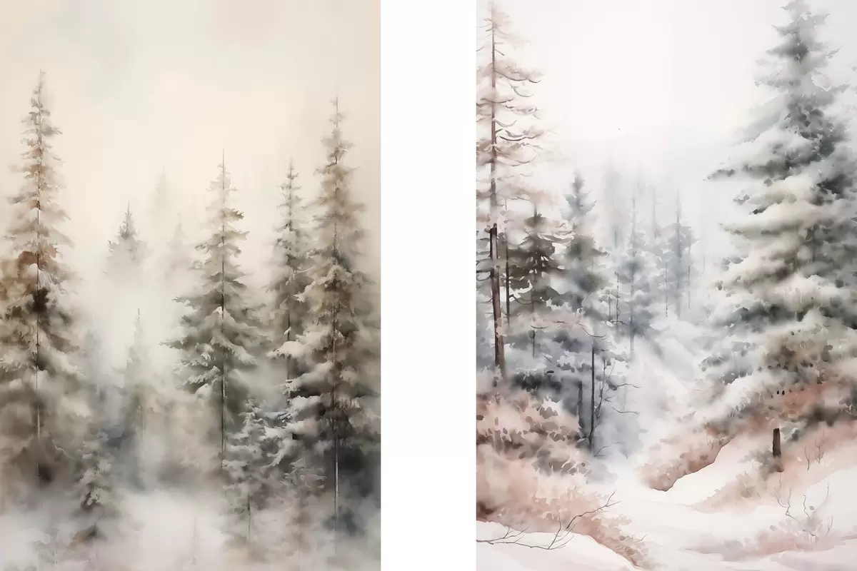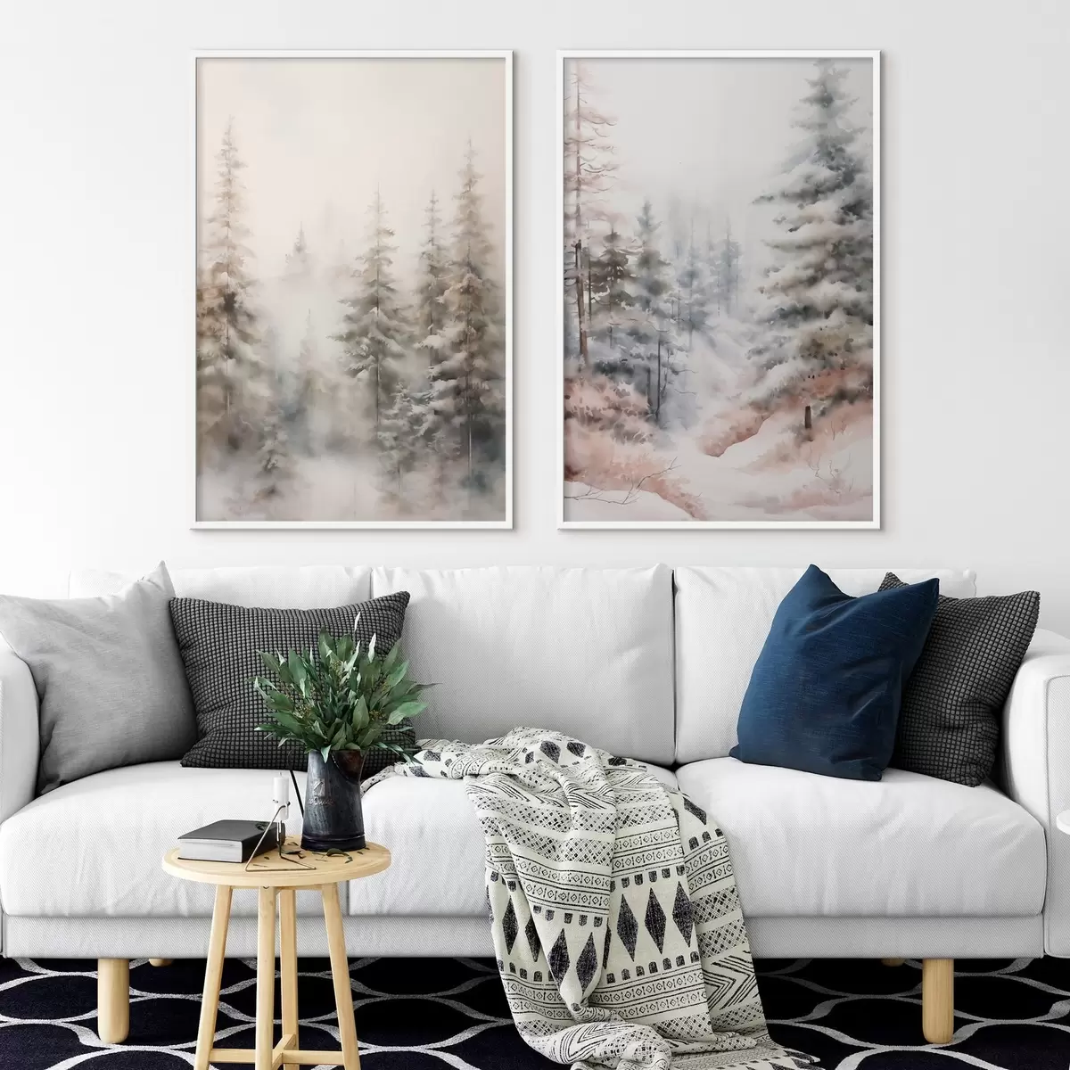 Постер на стіну Високі сосни, вкриті снігом, стоять у туманному лісі, м'яка, приглушена зимова сцена Nr d01011