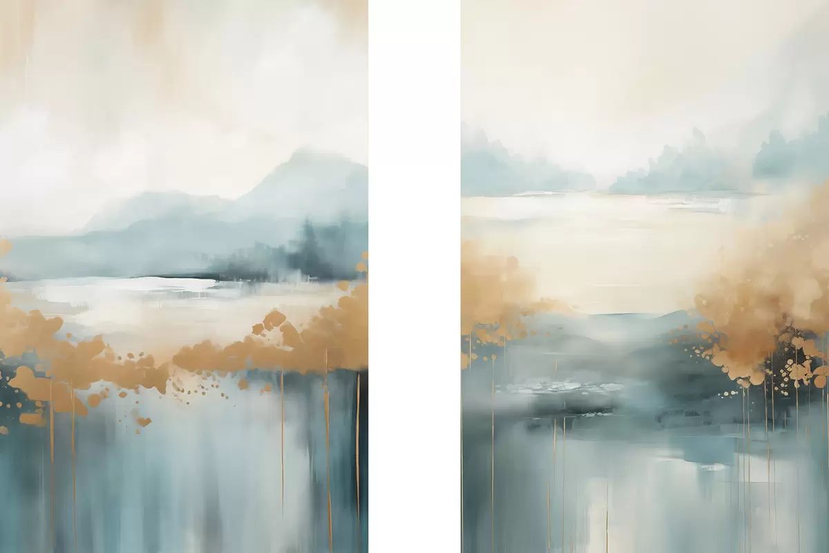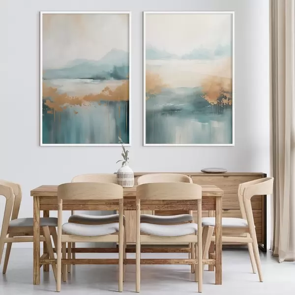 Постер на стіну Абстрактний пейзаж з горами та озером у кольорах бірюзового та текстурованого жовтого, м'які мазки пензлем, мінімалістичне мистецтво Nr d01012