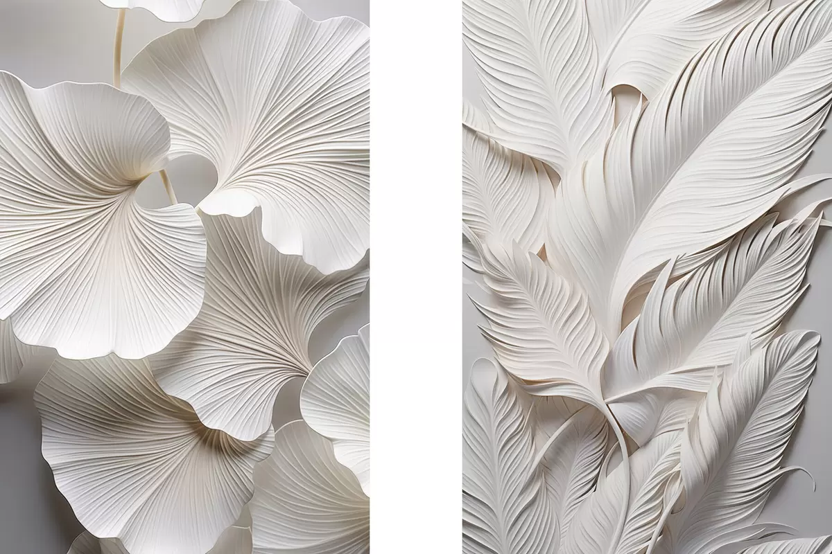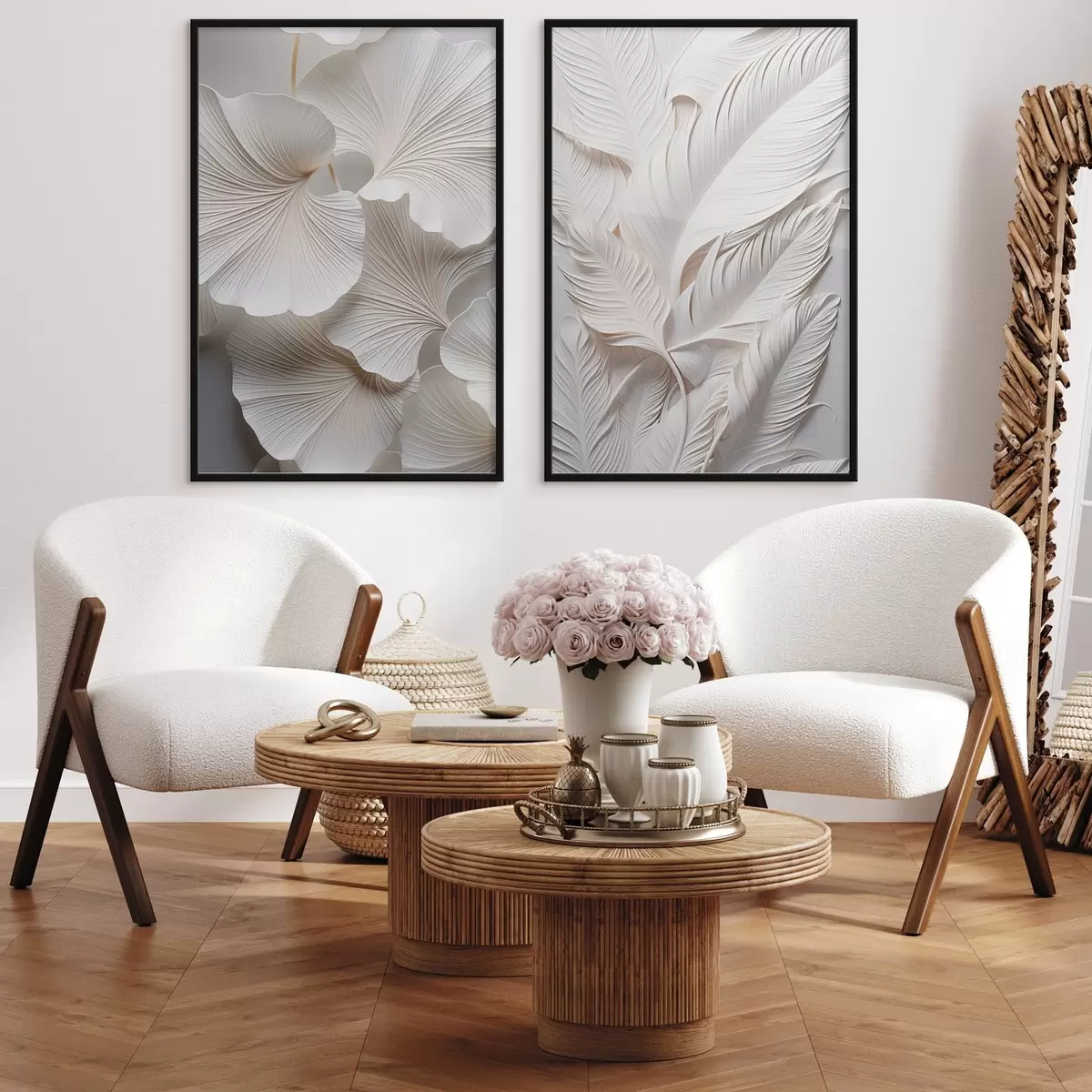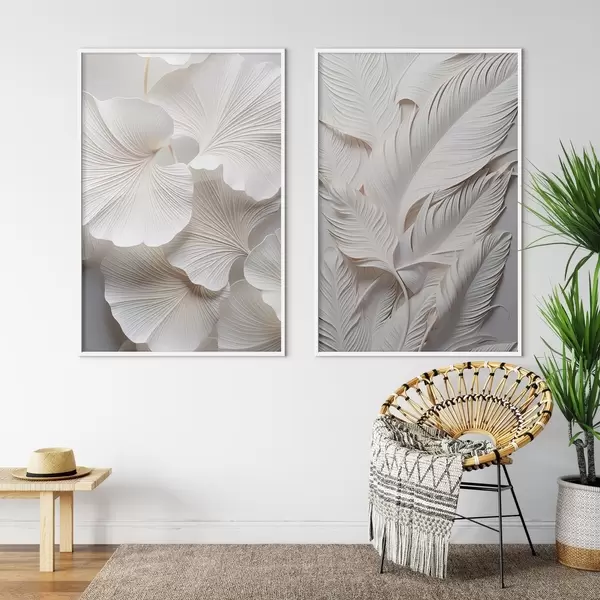 Постер на стіну Білі листя гінкго і довгі листя з витонченими деталями, що створюють ефект текстури і багатошаровості, мінімалістичне мистецтво Nr d01013