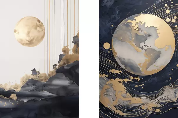 Постер на стіну Текстурована декоративна планета в космосі з жовтими лініями та крапками, абстрактний стиль, мінімалістичний та сучасний Nr d01014