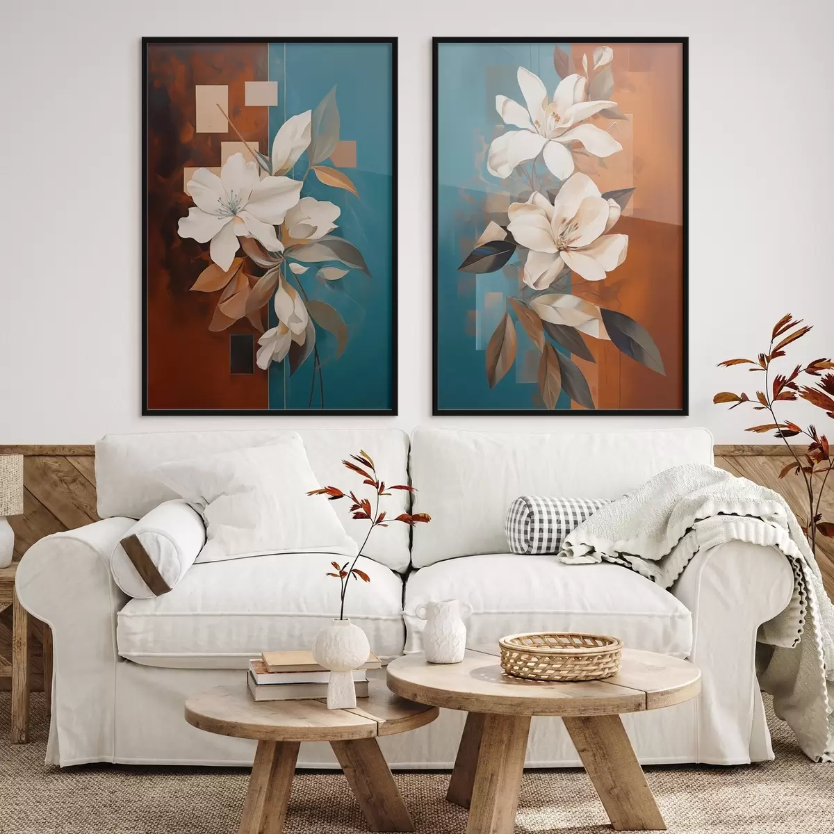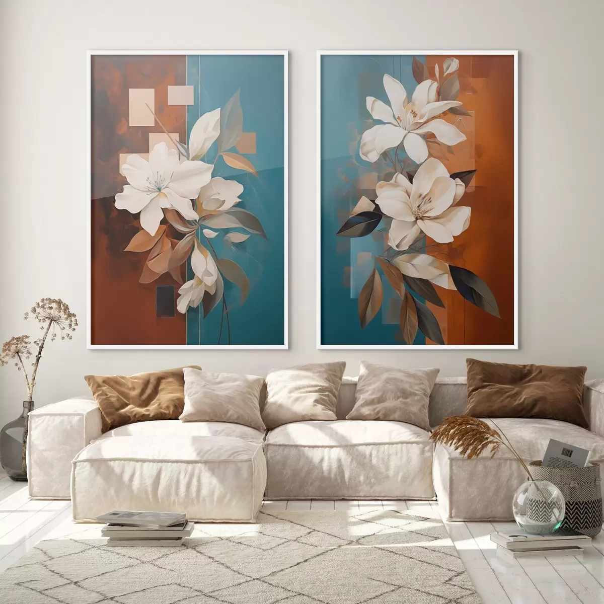 Постер на стіну Абстрактні білі квіти та листя на тлі коричневого та синього кольорів з абстрактними формами, у мінімалістичному стилі Nr d01015