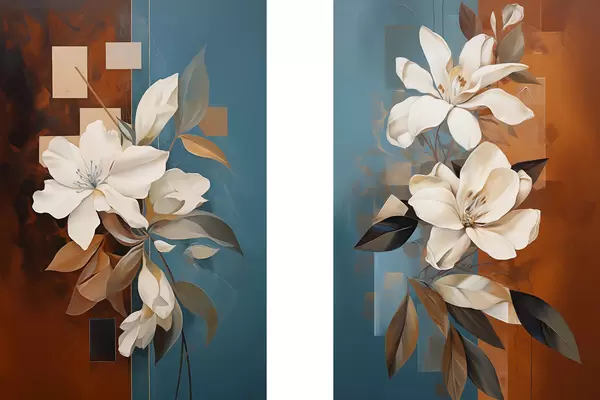 Постер на стіну Абстрактні білі квіти та листя на тлі коричневого та синього кольорів з абстрактними формами, у мінімалістичному стилі Nr d01015