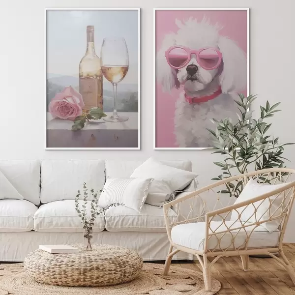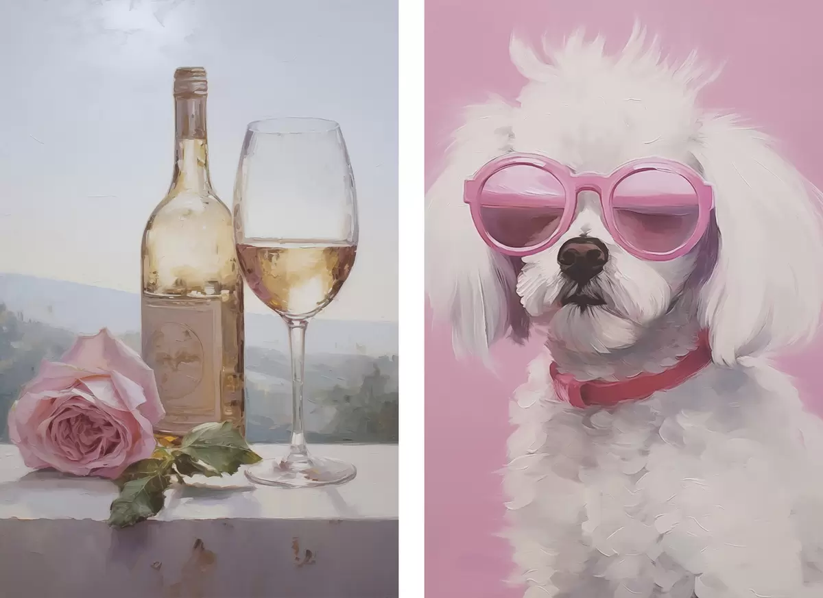 Постер на стіну Пляшка і келих вина, а також пудель в окулярах, імітація картини Nr d01021