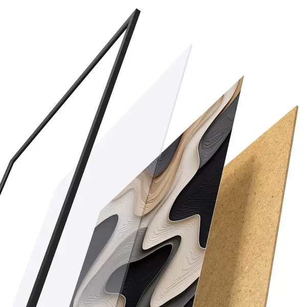Постер складається з рами, оргскла, надрукованого зображення та підкладки з ДСП. Завдяки кріпленням на звороті плакат можна одразу ж повісити на стіну.