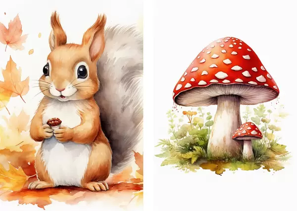 Постер на стіну Білка і лісові гриби, мухомор, імітація акварелі Nr d01049