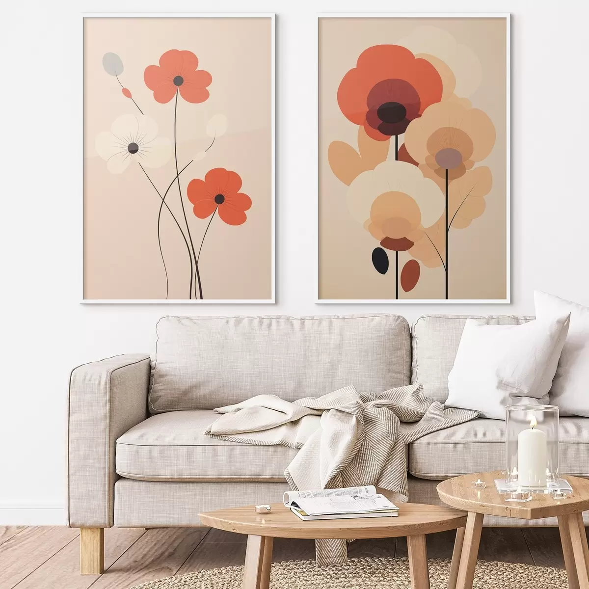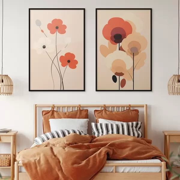 Постер на стіну Мінімалістичний квітковий диптих у теплих бежево-коралових тонах з графічними лініями Nr d01090