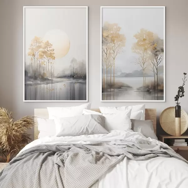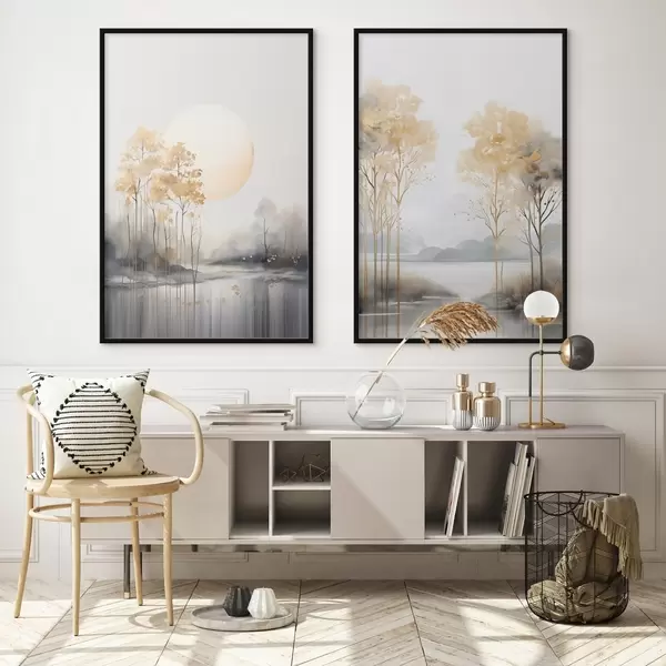 Постер на стіну Декоративний абстрактний пейзаж, високі дерева з жовтим листям, річка і туман на задньому плані Nr d01115