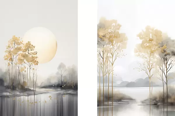 Постер на стіну Декоративний абстрактний пейзаж, високі дерева з жовтим листям, річка і туман на задньому плані Nr d01115