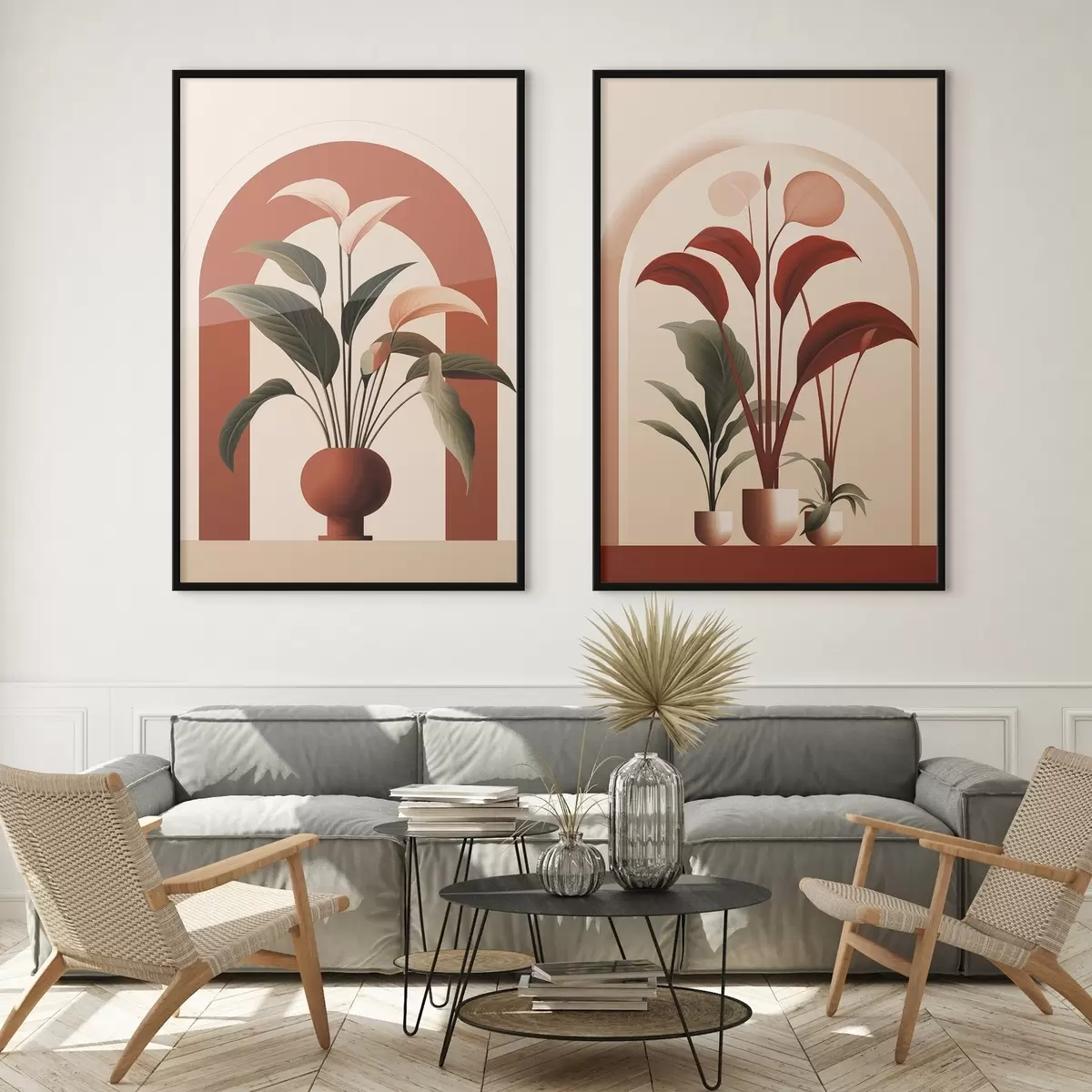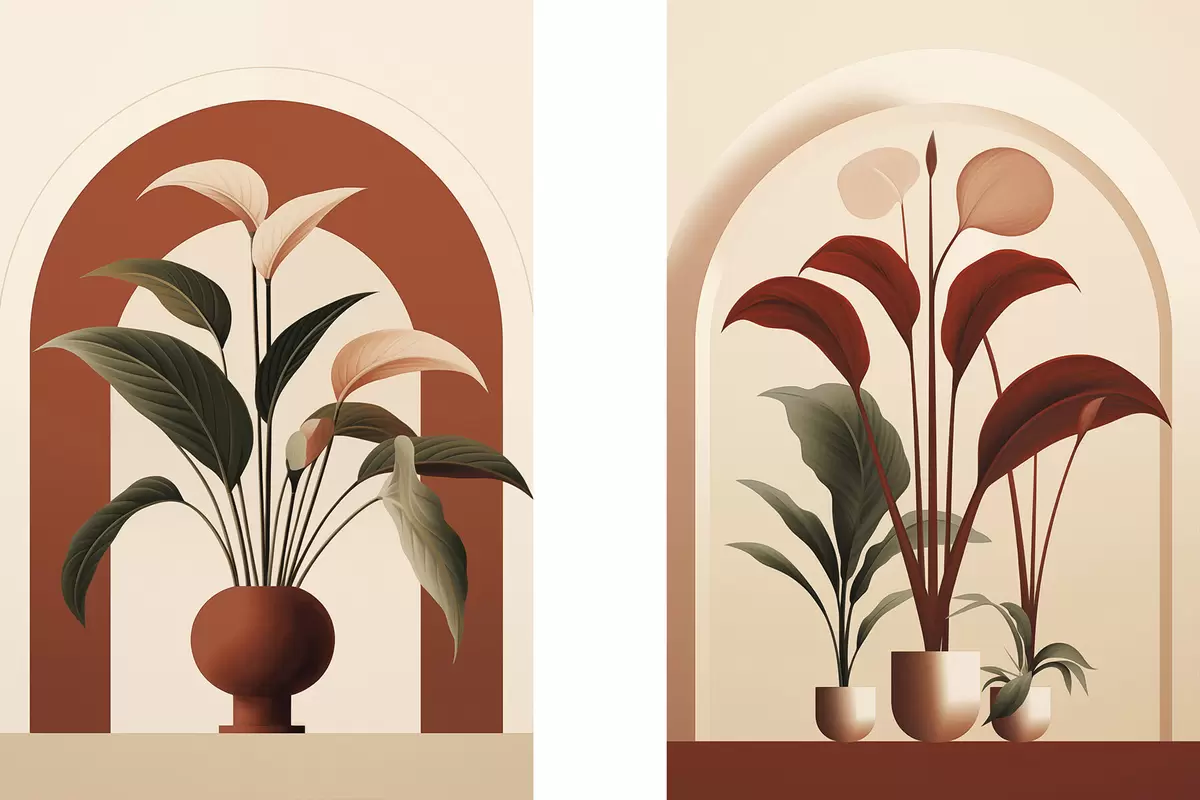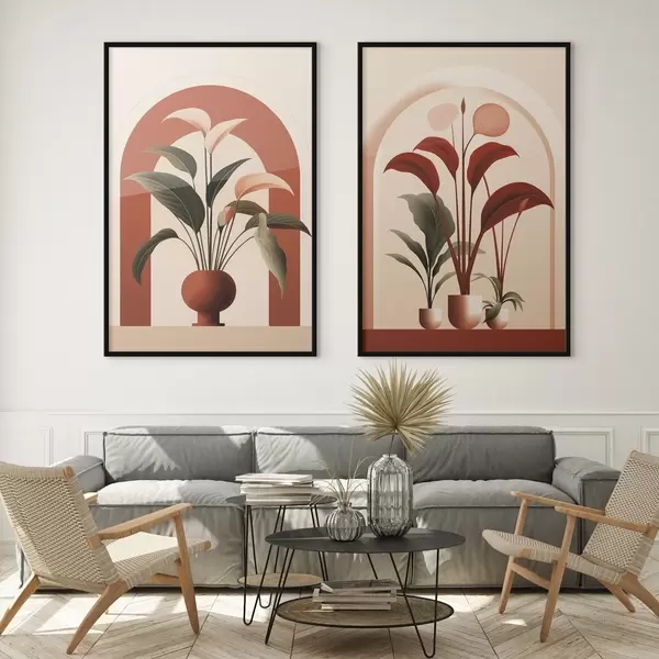 Постер на стіну Абстрактні рослини в горщиках з великими зеленими і червоними листям перед кремовою аркою Nr d01124