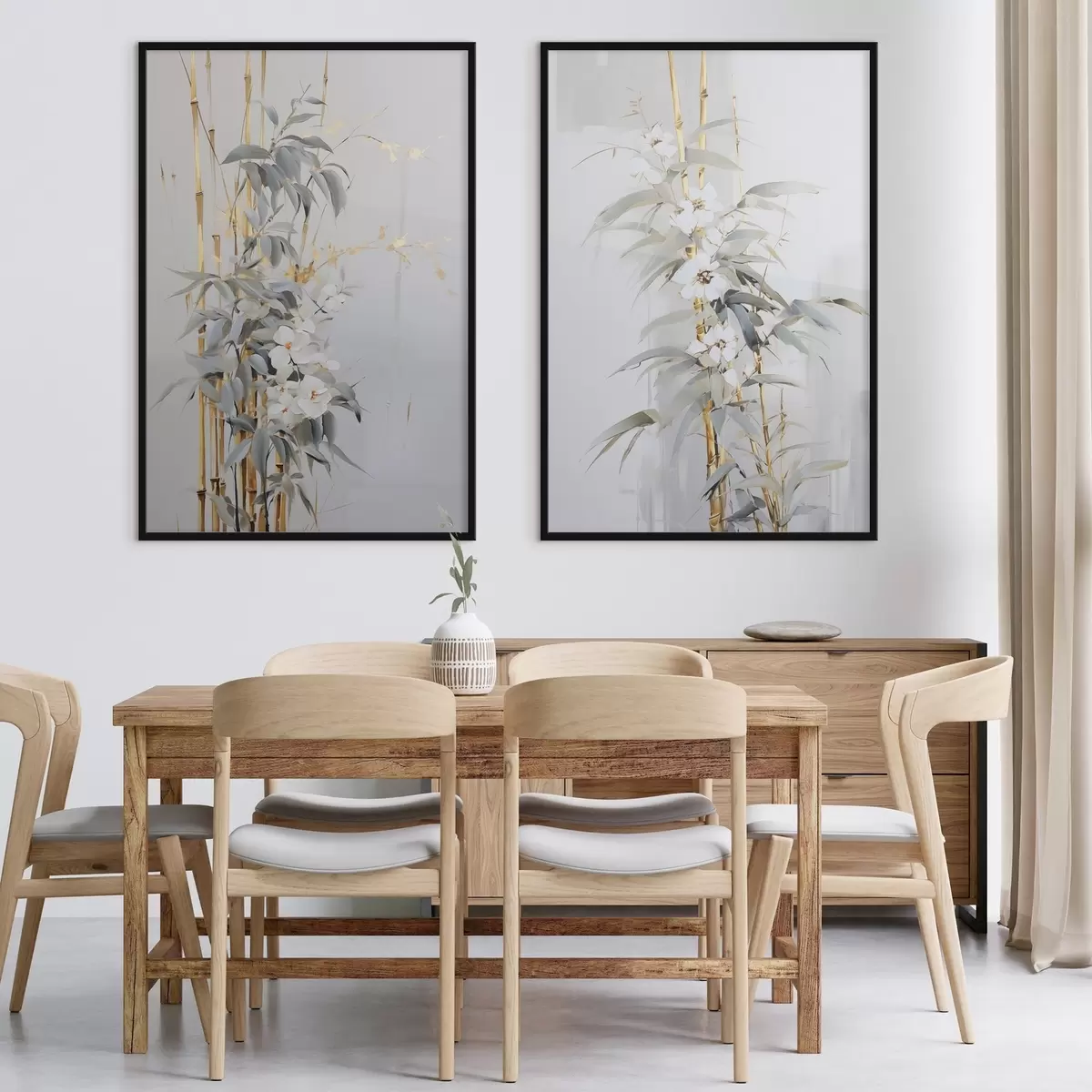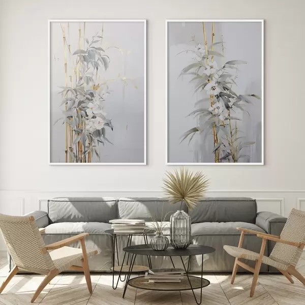 Постер на стіну Абстрактні бамбукові стебла з жовтими акцентами, ніжні білі квіти та блідо-зелене листя, сірий фон Nr d01127