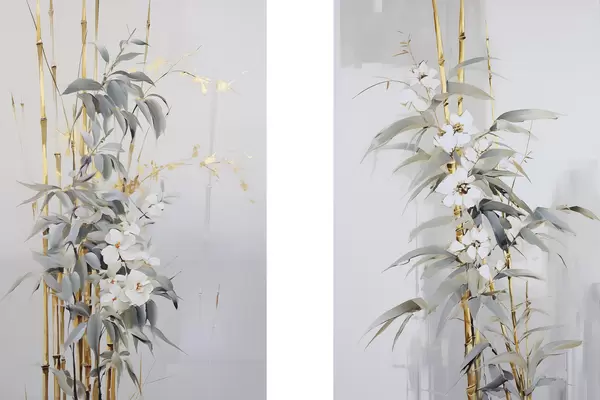 Постер на стіну Абстрактні бамбукові стебла з жовтими акцентами, ніжні білі квіти та блідо-зелене листя, сірий фон Nr d01127