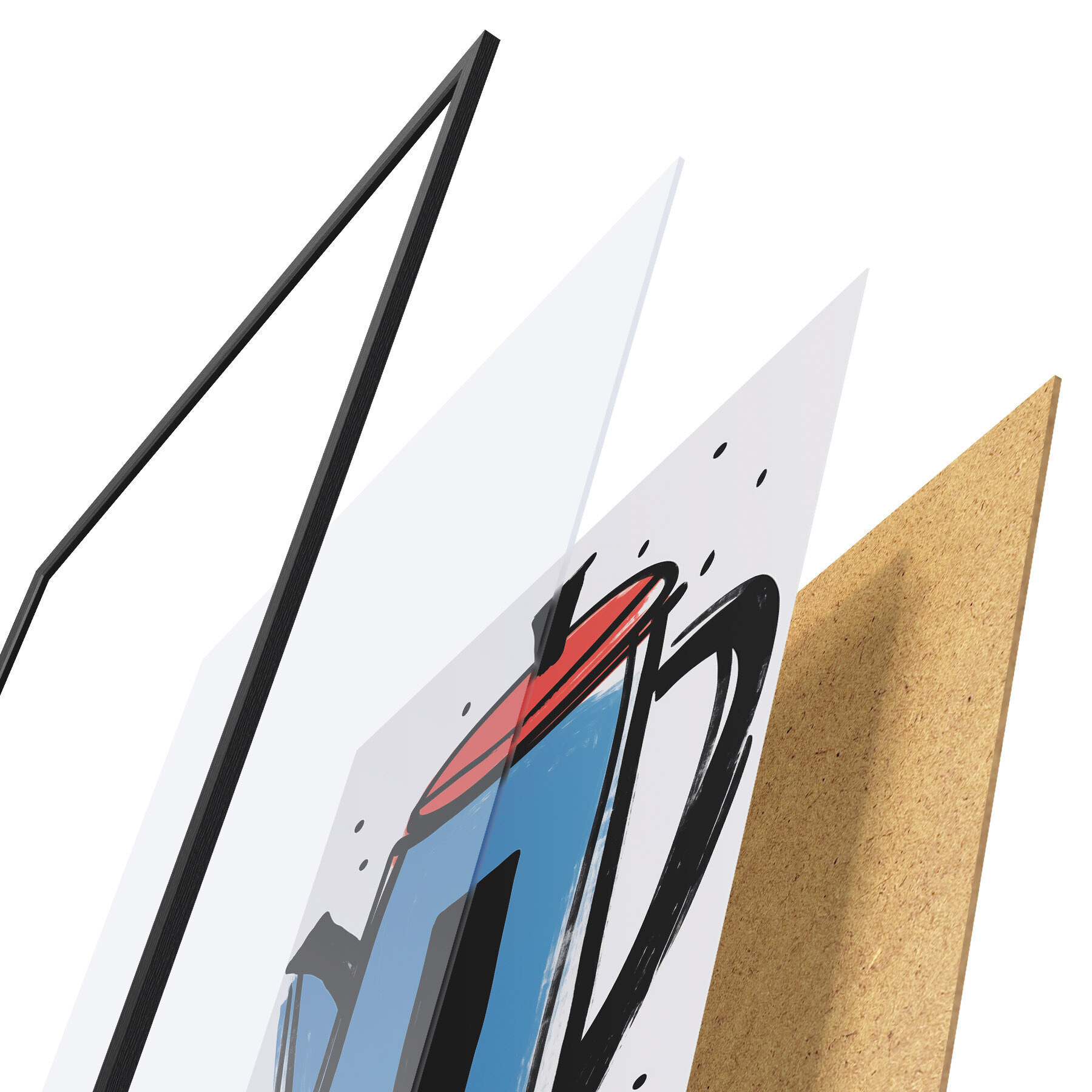 Постер складається з рами, оргскла, надрукованого зображення та підкладки з ДСП. Завдяки кріпленням на звороті плакат можна одразу ж повісити на стіну.