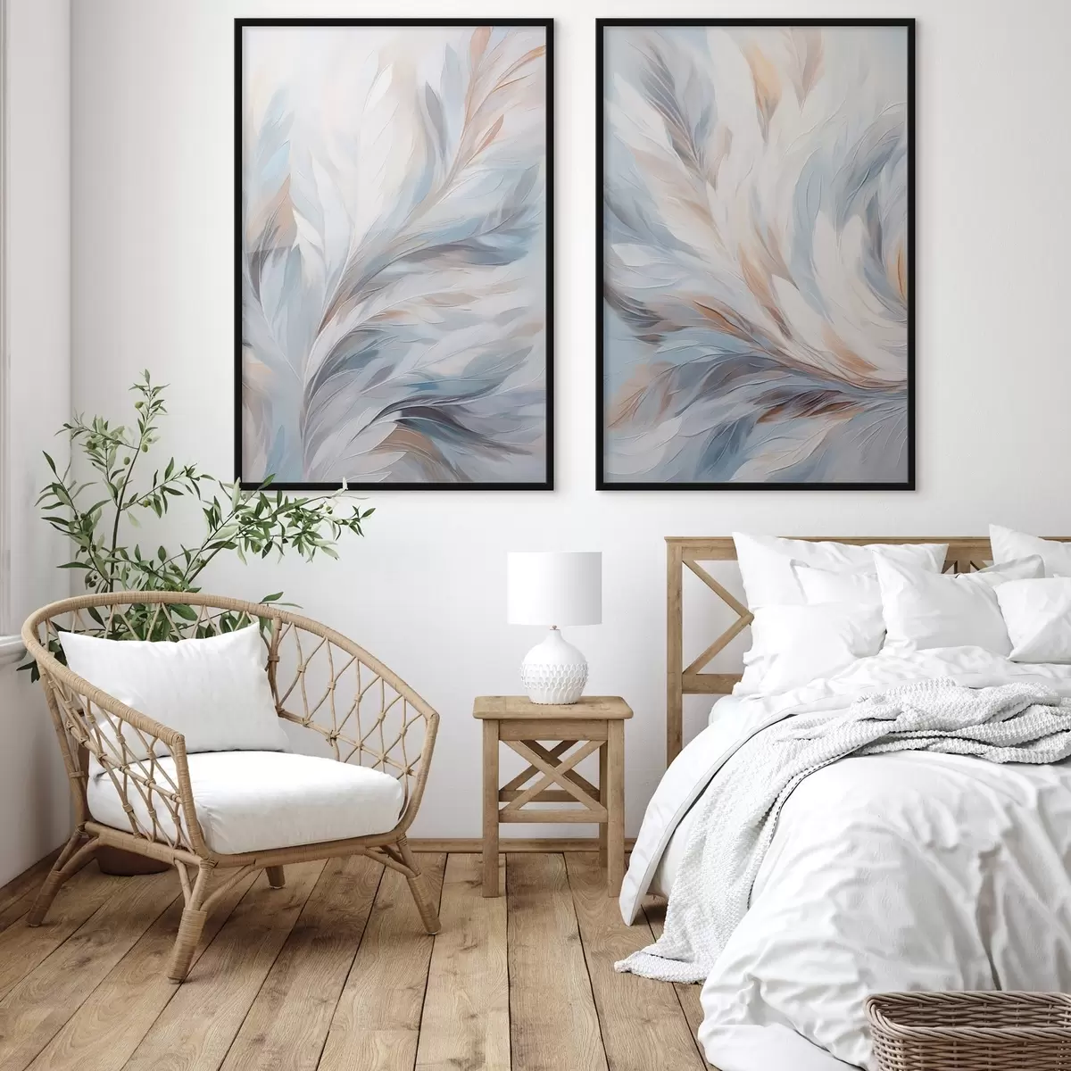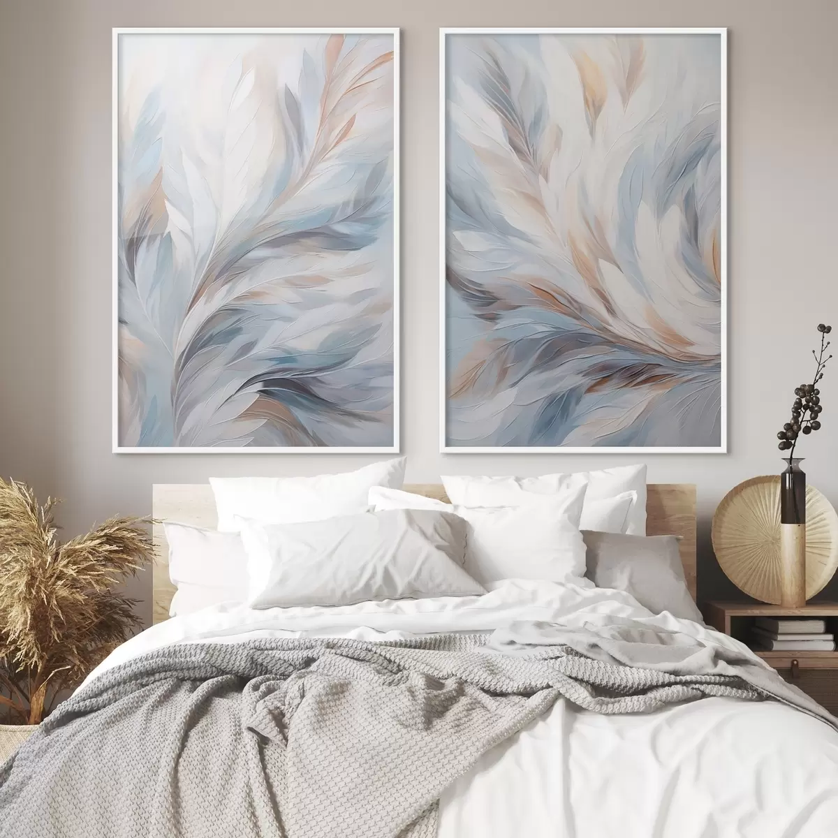 Постер на стіну Абстрактне зображення пір'я в відтінках білого, синього та коричневого кольорів, з м'якою, плавною текстурою та світлим фоном. Nr d01234