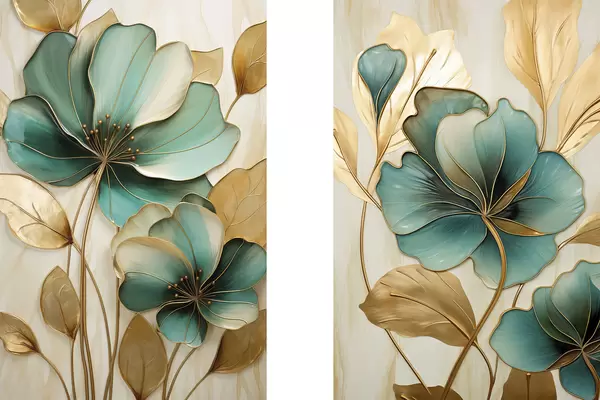 Постер на стіну Великі блакитно-жовті квіти з контурами, оточені жовтим листям на абстрактному тлі Nr d01235