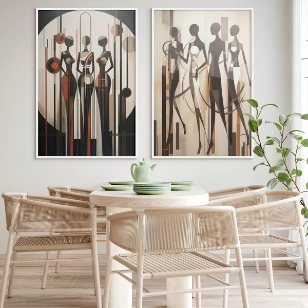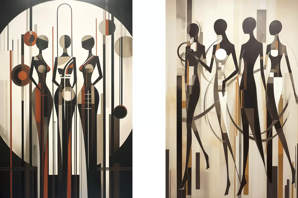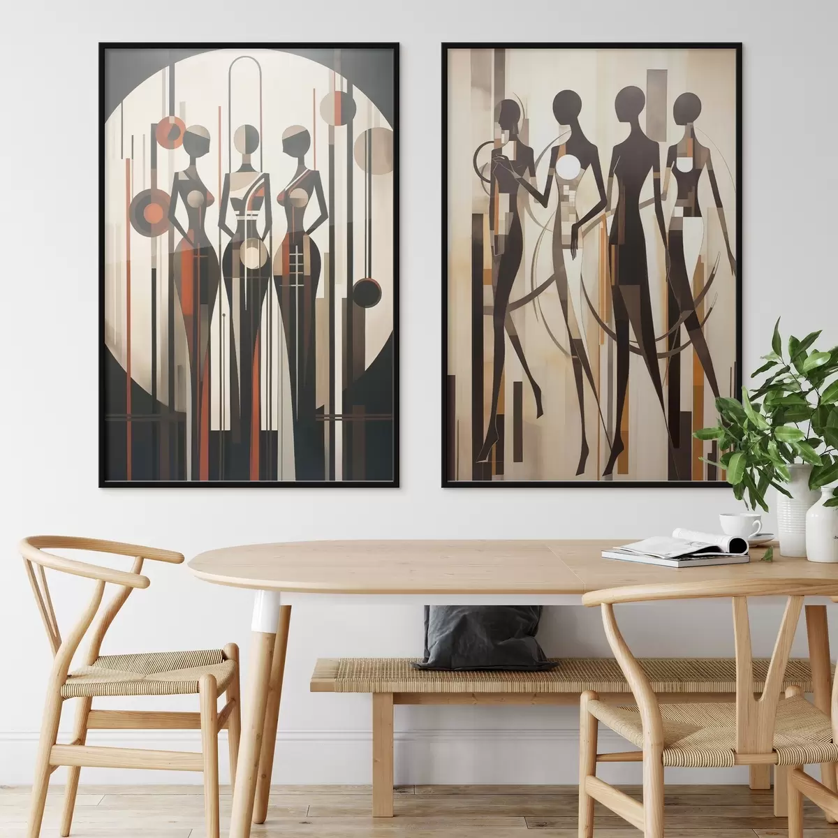 Постер на стіну Стилізовані жіночі фігури з геометричними елементами на абстрактному тлі з вертикальних ліній і кіл Nr d01237