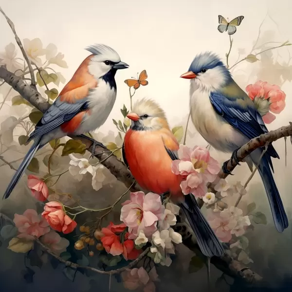 Постер на стіну Група птахів на гілці з квітами Nr f38103