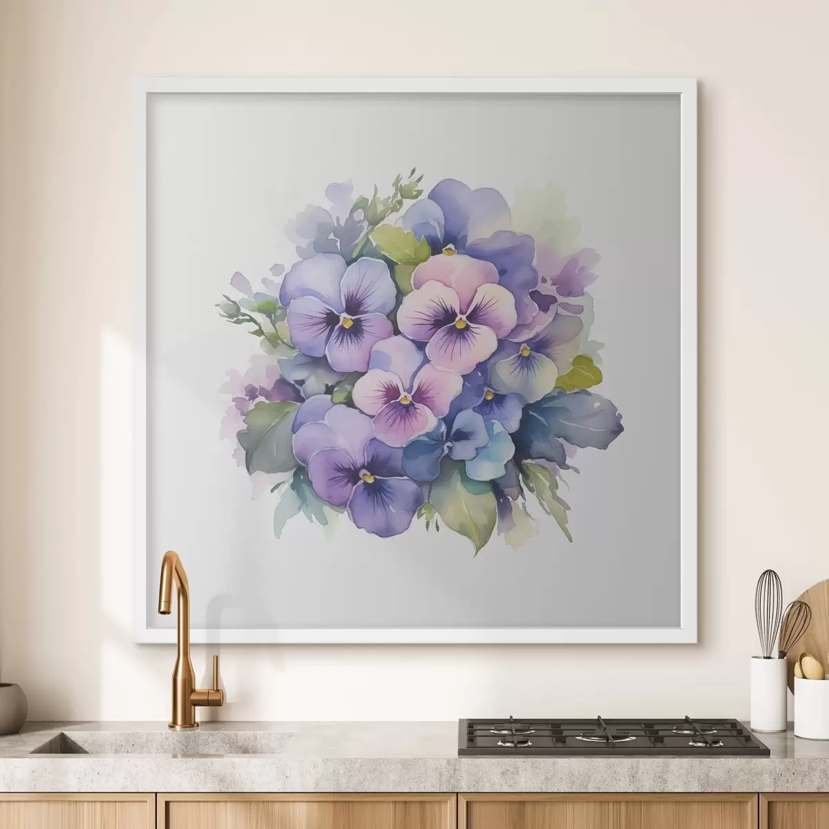 Постер на стіну Фіалки аквареллю ілюстрації, букет, квіти, синій, фіолетовий, зелений колір Nr f38486