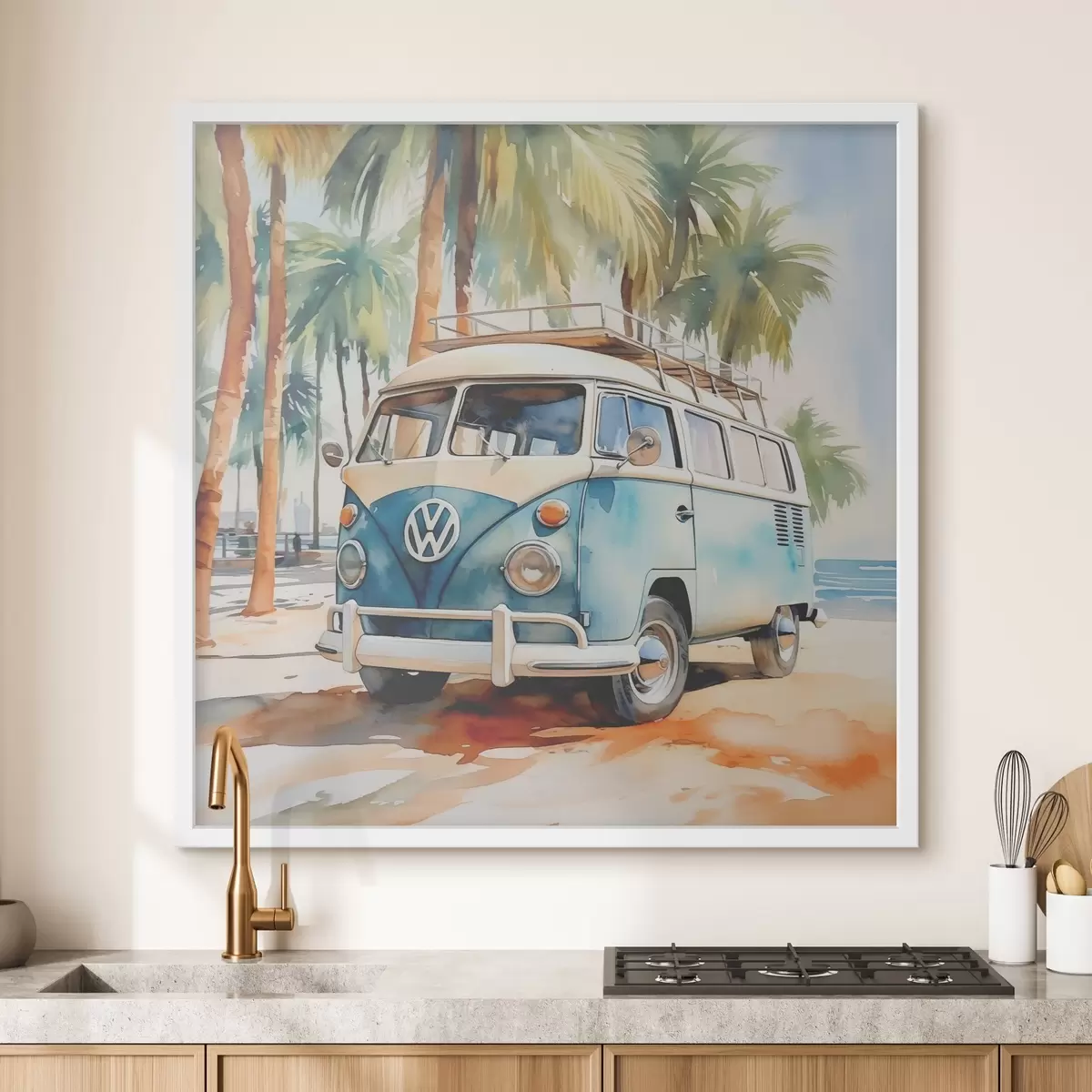 Постер на стіну На пляжі на тлі акварельних пальм припаркований автомобіль для подорожей Nr f38911