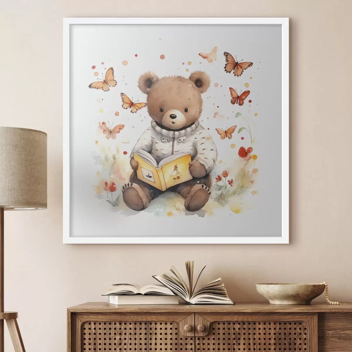 Постер на стіну Бурий ведмідь у светрі читає книгу в оточенні акварельних метеликів Nr f39025