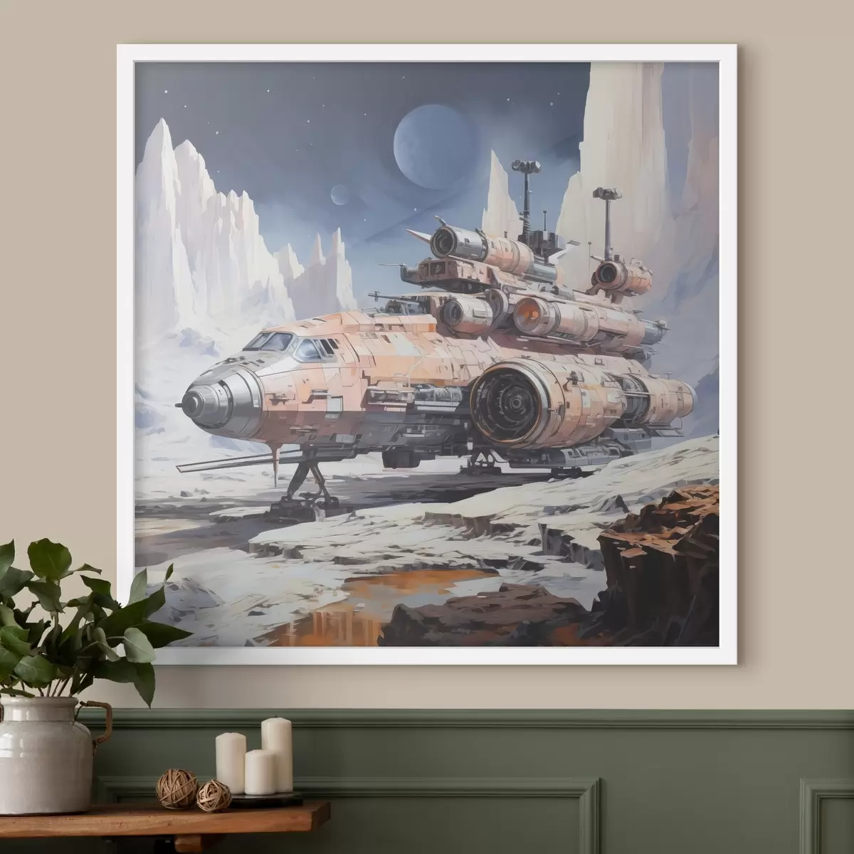 Постер на стіну Космічний корабель у стилі кіберпанк стоїть на поверхні Місяця в космосі серед гір, синій, бежевий, білий колір Nr f39114