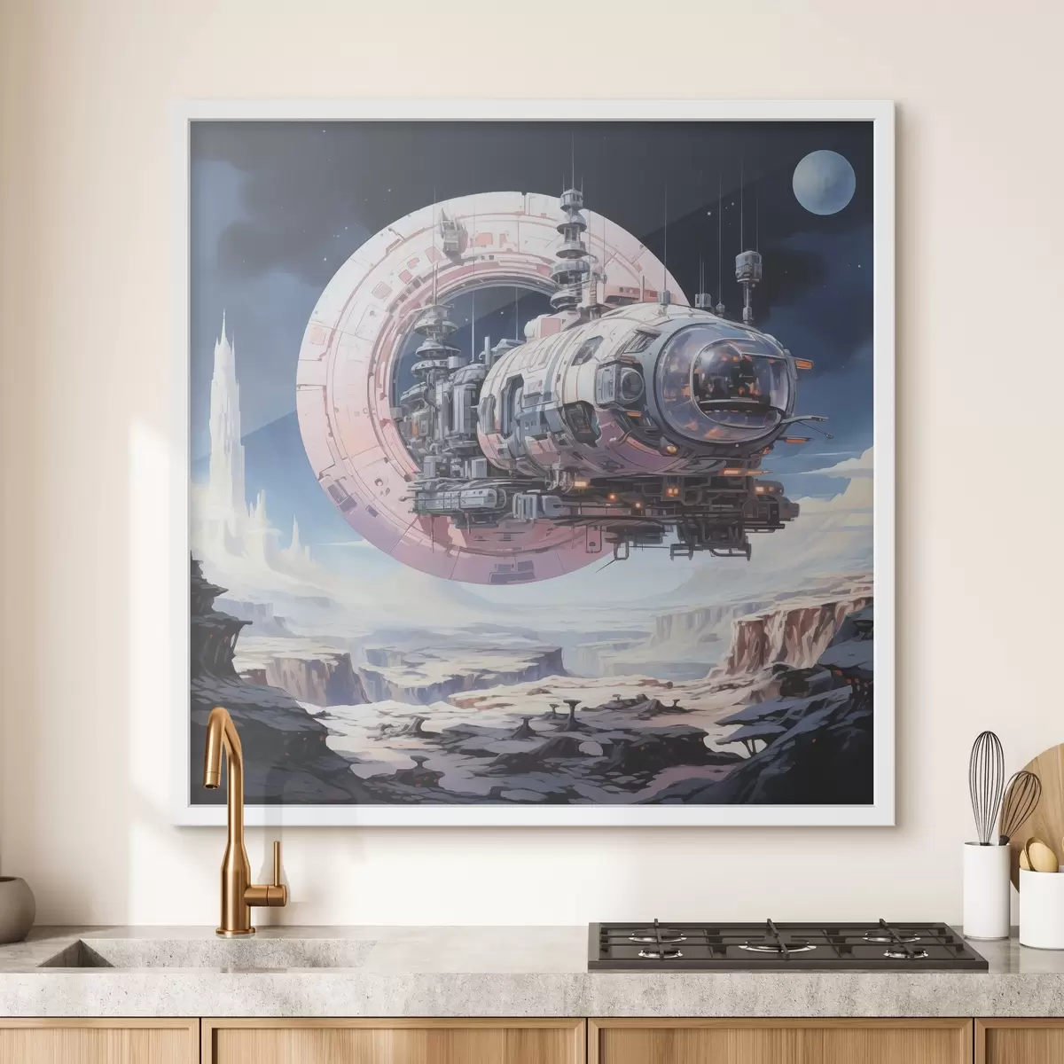 Постер на стіну Космічний корабель у стилі кіберпанк пролітає в космосі над астероїдом і планетою, синій, бежевий, рожевий, білий колір Nr f39115
