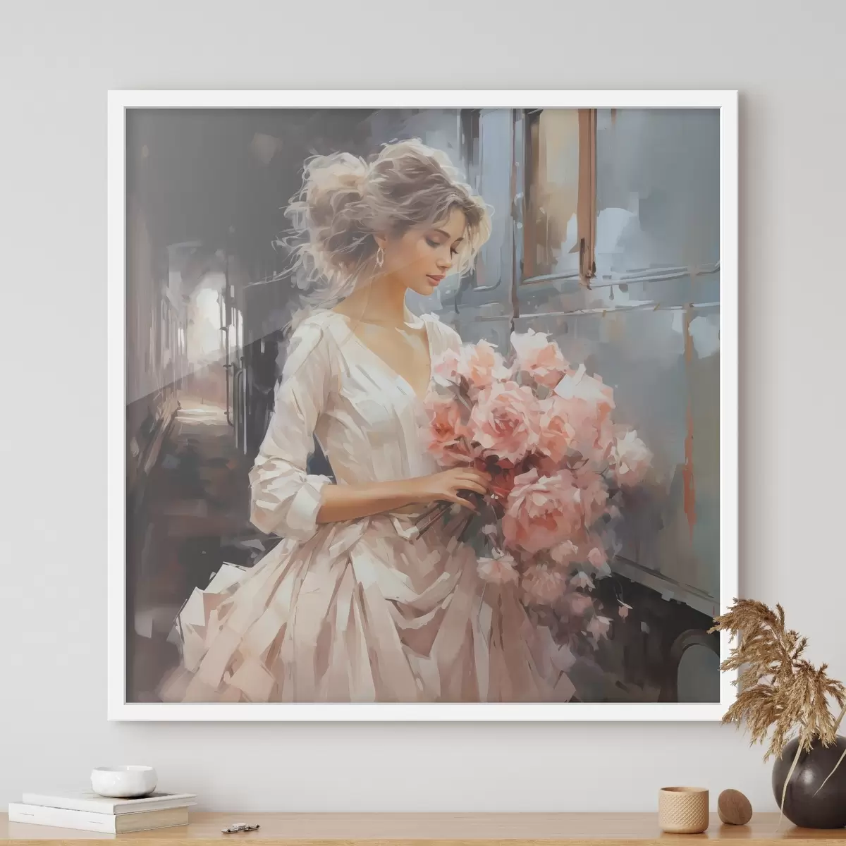 Постер на стіну Дівчина в білій сукні на вокзалі тримає в руках букет рожевих троянд, картина олією Nr f39438